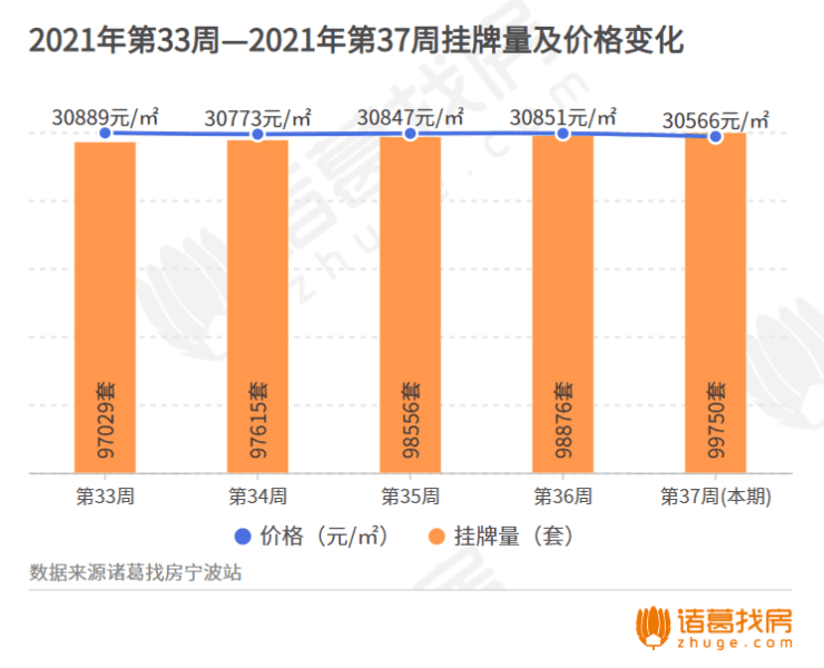 据诸葛找房宁波站数据统计,上周(9.6-9.12)宁波二手房挂牌房源量为99750套,挂牌均价为30566元/平,相比上周(30851元/平),环比 下跌0.9%,基本持平状态 。