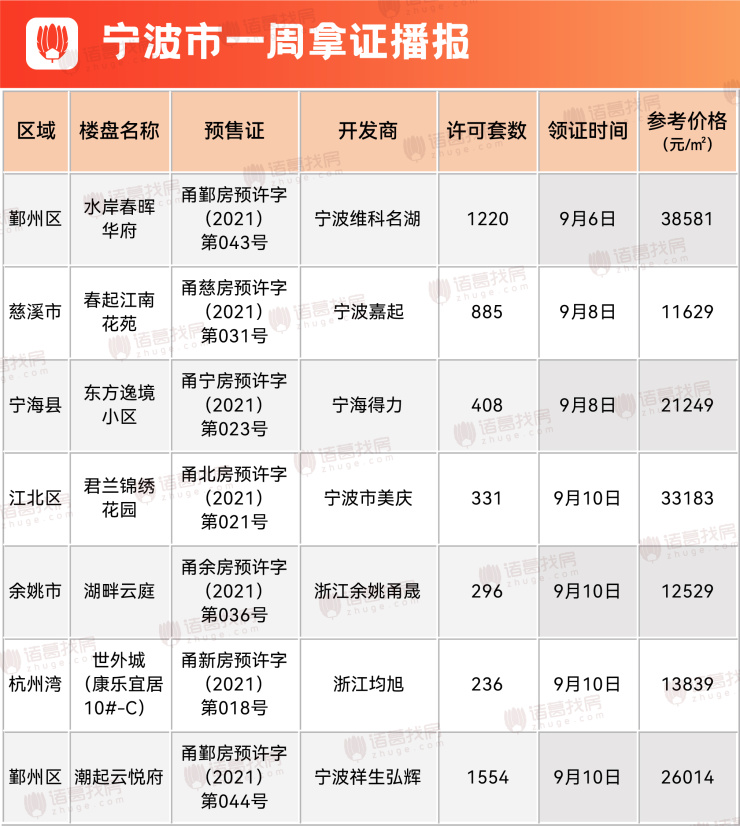 上周宁波大市共7个楼盘取得许可证,入市房源共计 4930套 ,其中市六区共计 3105套 。