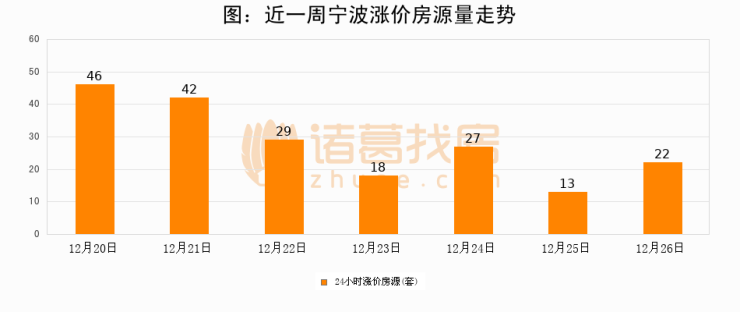 根据诸葛找房数据显示,宁波24小时涨价房源量为22套,较12月25日增加9套,环比上涨69.2%。与此同时,涨价房源占比小幅扩大,业主信心有所提升。
