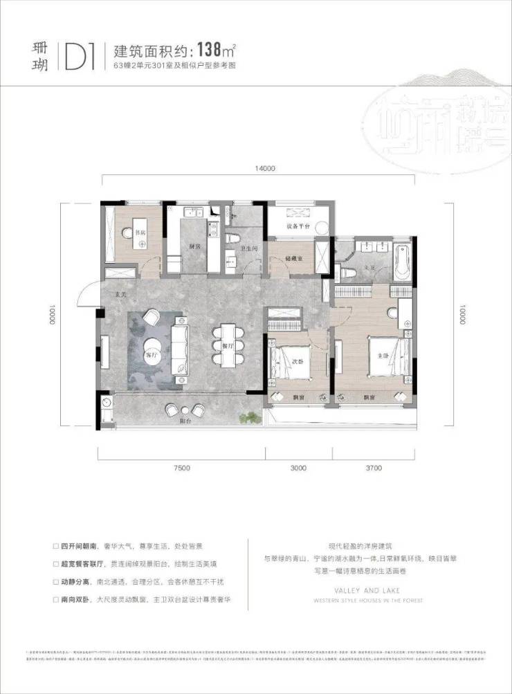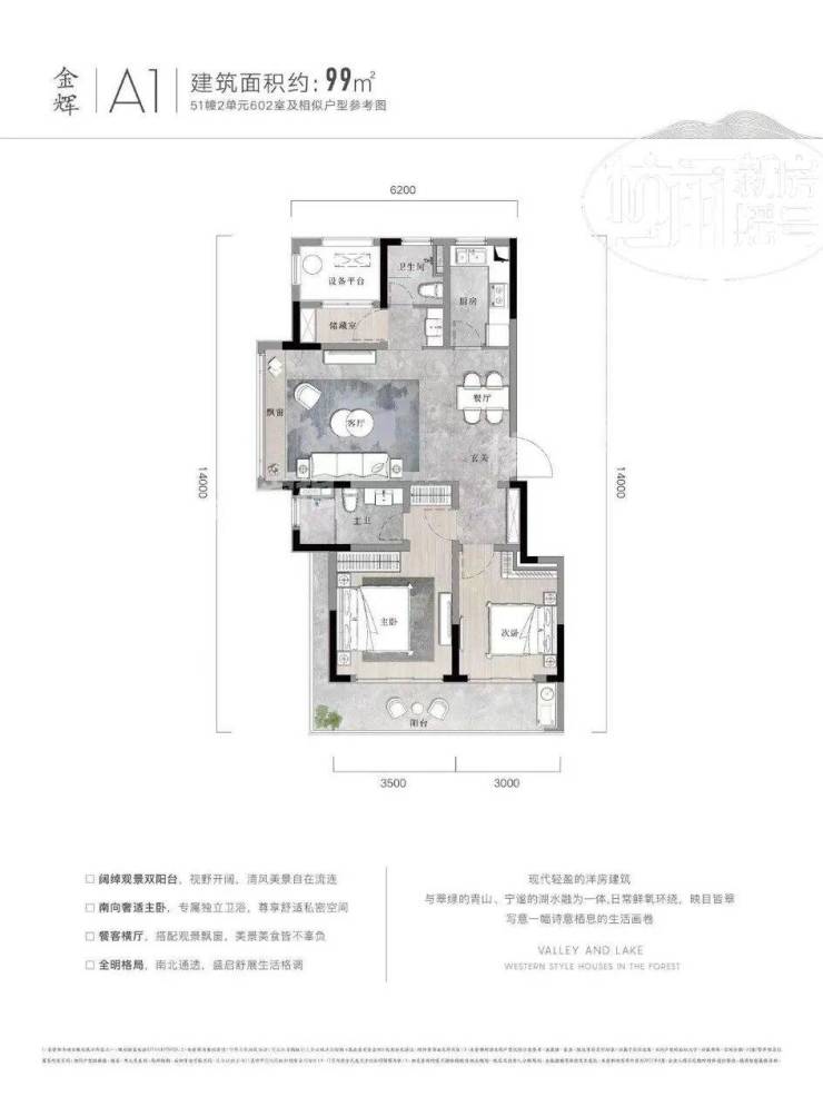 户型为2房2厅2卫,双阳台设计,完美匹配湖山美景。客餐厨动线合理,观景飘窗连通了室内室外两重空间。南北通透、分区合理,尤其是储藏室的设计,十分贴心。99㎡的大两居,恰到好处地放大了各个功能区,整体看过去十分舒畅。