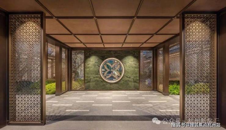 采用“王府中式”设计,大门为歇山顶形制(宽53米、高近11米),配黄铜狮、罗汉松及蓝翡翠奢石。园林融入西湖十景元素,如“花港观鱼”水景、“柳浪闻莺”绿植,并设雾森系统首层单元门厅石材铺就,肌理沉稳。