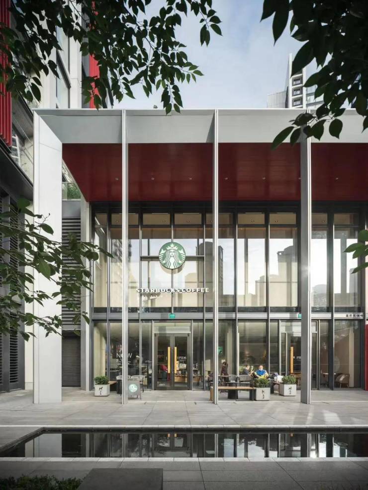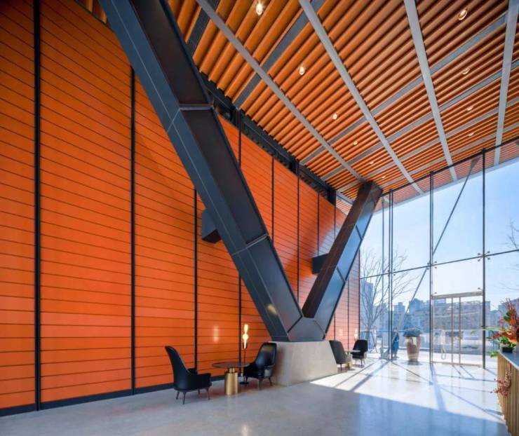 极具辨识度的红黄渐变外立面、270°转角无柱落地窗完美呈现,哪怕在春日不够耀眼的光线下,整个建筑仍折射出极有光泽的细节变幻。