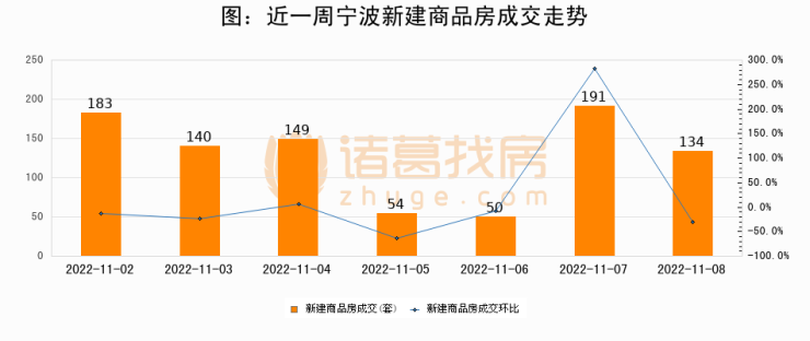 根据宁波市房产市场管理中心数据显示,2022年11月08日宁波新建商品房成交134套,较昨日减少57套,环比下降29.8%