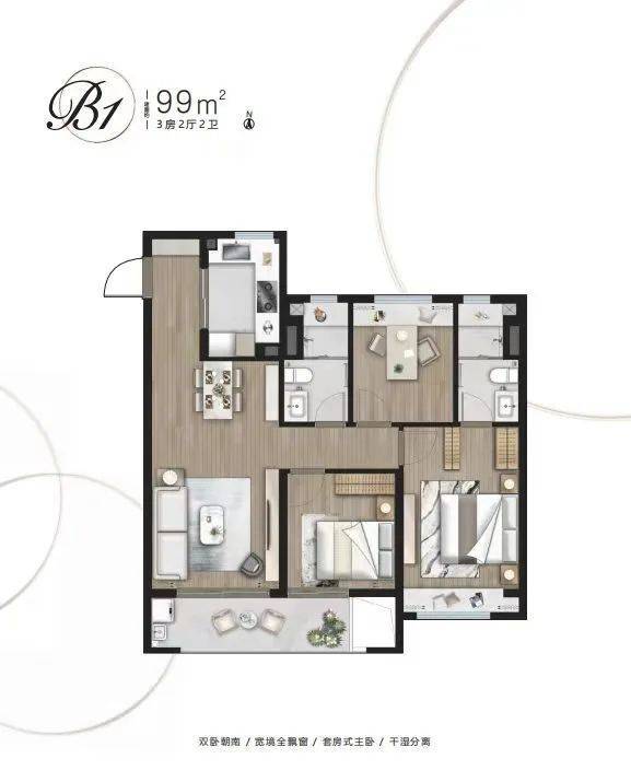 99㎡:3室2厅2卫(B1/B2户型),部分带大横厅,总价约432万