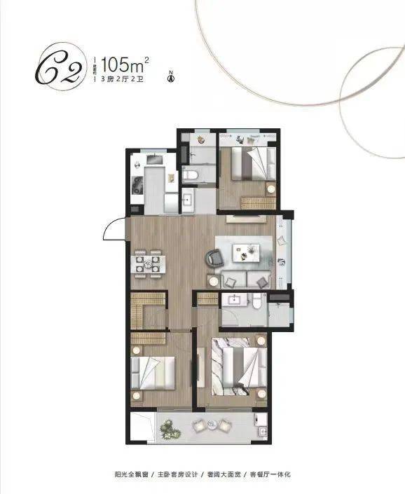 105㎡:3室2厅2卫(C1/C2户型),竖厅设计,客厅采光面3.6米,总价约451万