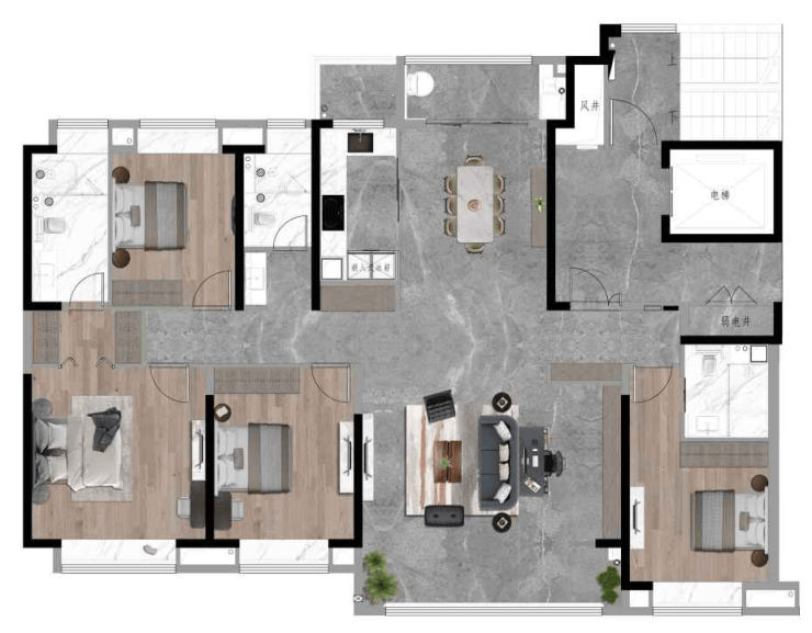 南向三卧室,保证了每一个空间的尺度,让每一个家庭成员都是“主角”。而且还设置北向专属家政间,动线与主人分离,做到不打扰、不干涉,确保居住私密性。