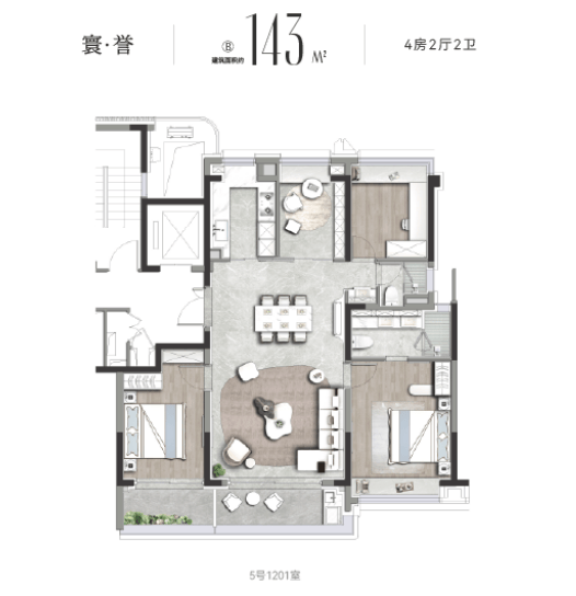 预算充足的改善家庭,还可选择约143㎡4房户型。作为内环内稀缺的控总价4房,它在尺度与舒适度上颇为出彩: