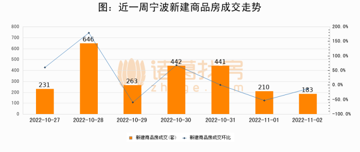 根据宁波市房产市场管理中心数据显示,2022年11月02日宁波新建商品房成交183套,较昨日减少27套,环比下降12.9%
