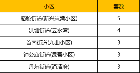 其中骆驼街道(新兴岚湾小区)成交5套,位列榜首。