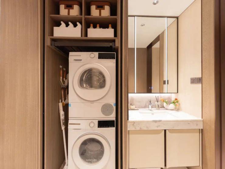 它整合了洗烘套件、分类收纳,将洗衣、烘干、收纳整理集中于一体。另外据说后期开发商可提供阳台改造隐形晾衣架服务,供业主自主选择烘干或晾晒。