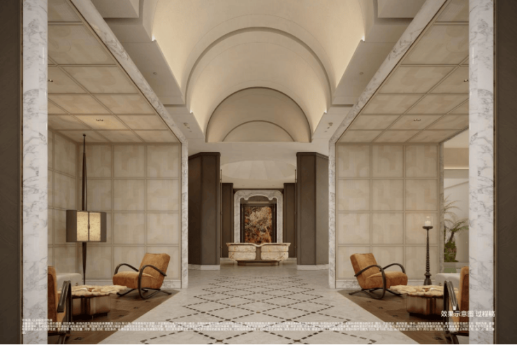归家八角厅:以法式为底蕴,地面与墙面精选贝金米黄大理石与卡拉白大理石铺陈,纹理如山水画般自然流动。