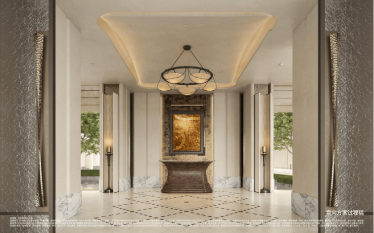 入口处悬挂量身定制的装置作品,以现代语言呼应新经典主义美学,从第一印象奠定社区艺境格调。