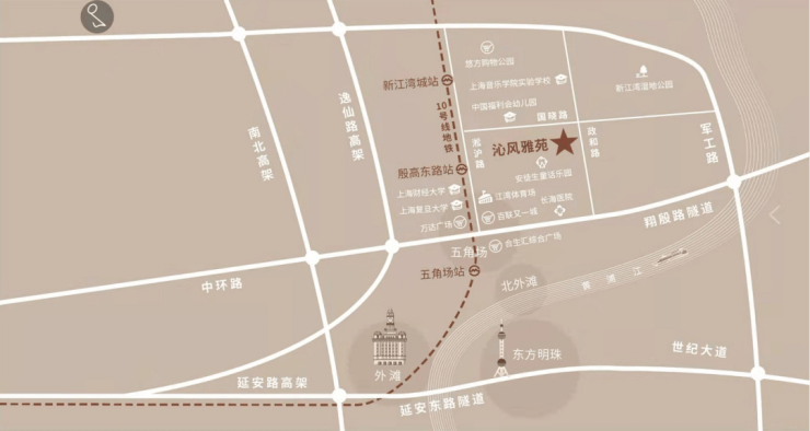 距离地铁10号线新江湾城站约1.5公里,步行约20分钟