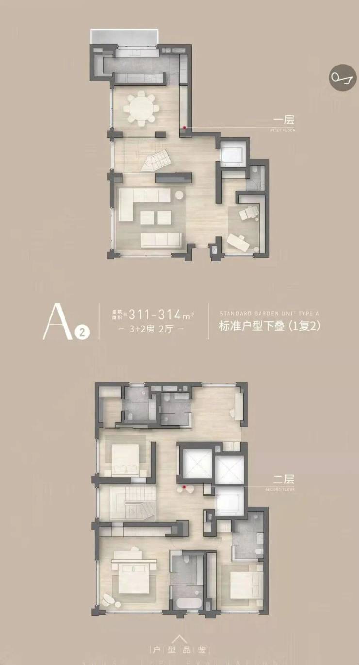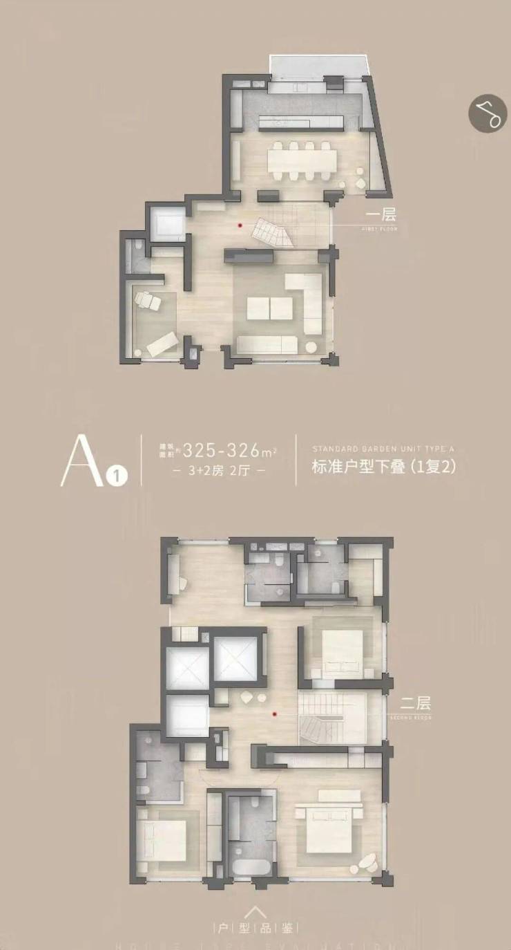 A1下叠:约325㎡,三室两厅五卫,首层设开放式厨房与客厅