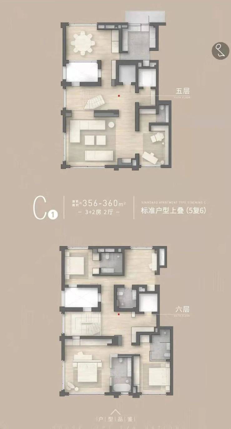 C1上叠:约356㎡,三室两厅五卫,顶层整层主卧套房,270°观景视野
