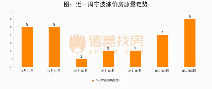 根据诸葛找房数据显示,宁波24小时涨价房源量为6套,较05月04日增加2套,环比上涨50%。与此同时,涨价房源占比小幅扩大,业主信心有所提升。