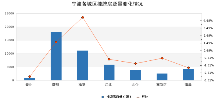 二、北仑环比涨幅居首,鄞州挂牌房源量先进