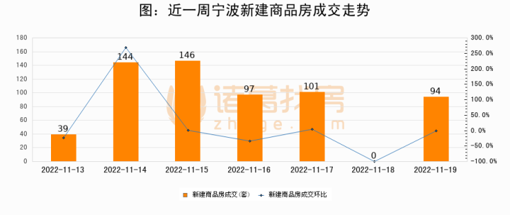 根据宁波市房产市场管理中心数据显示,2022年11月19日宁波新建商品房成交94套,较昨日增加94套,环比上涨0%