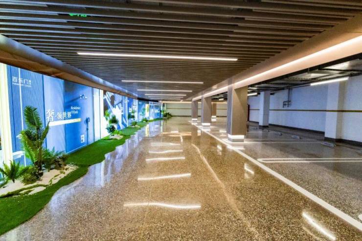 再将目光聚焦到一般项目容易忽视的地库空间。明亮阔绰的地库空间内,顶部以咖色格栅及吊顶光源重塑空间层次感,与之相对应的是在灯光下熠熠生辉的彩石地坪。