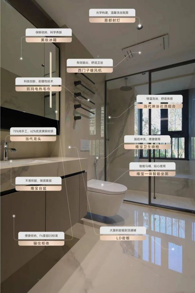 此外,室内还包含了“环球供暖先行品牌”Vaillant地暖、日系著名品牌HITACHI中央空调、德系精工品牌代表SIEMENS的开关面板和凉霸浴霸等。