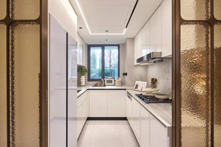 厨房采用深U型极致收纳设计,遵循“取、放、洗、切、炒”黄金动线,操作空间宽绰,收纳能力拉满,让厨房整洁有序