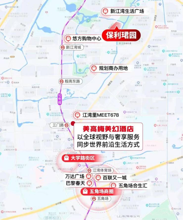 周边环绕江湾里MEET678、悠方购物生活广场、五角场商圈、大学路、新江湾城生活广场五大摩登商圈,涵盖潮流购物、特色餐饮、亲子娱乐、高端消费等全业态,步行可达社区商业满足日常所需,无需远离低密静谧,即可拥抱城市繁华