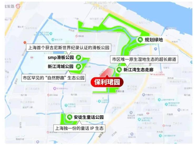 除此之外,项目周边环绕着新江湾城生态走廊、安徒生童话乐园、新江湾城公园、SMP滑板公园四大城市公园,约21公里绿道与约18公里河道交织成网,形成庞大的生态景观集群