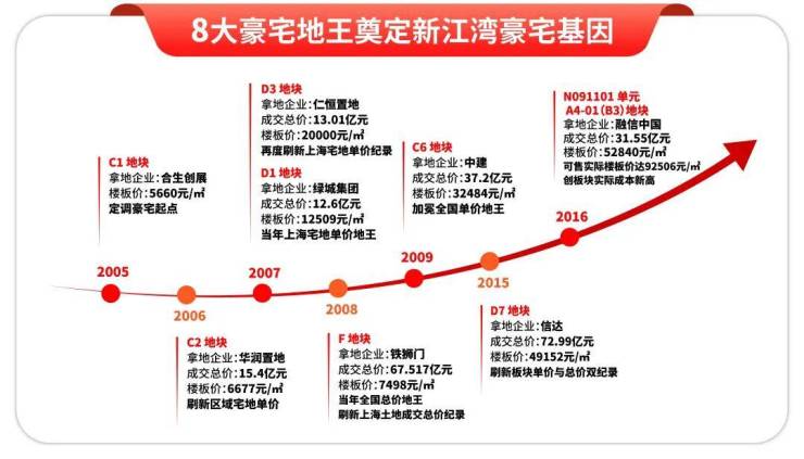 自2005年区域有土地成交伊始,新江湾城便开启了地王争霸的序幕,十年间8个地王项目,总价地王、单价地王纪录不断被刷新,镌刻着板块不可撼动的高端地位
