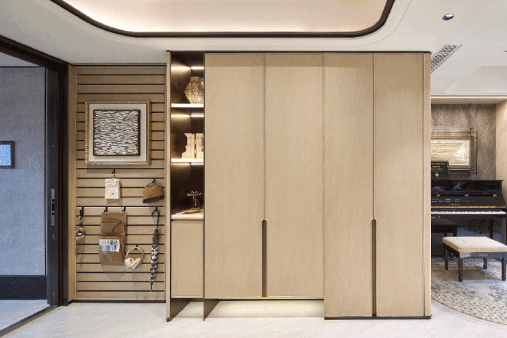 玄关配备小红书爆款多功能条板收纳墙,灵活适配杂物收纳需求;