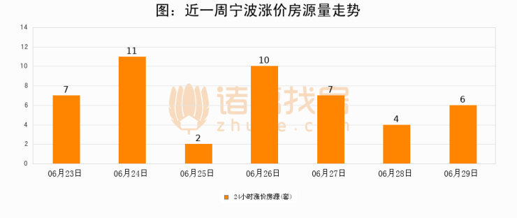 根据诸葛找房数据显示,宁波24小时涨价房源量为6套,较06月28日增加2套,环比上涨50%。与此同时,涨价房源占比小幅扩大,业主信心有所提升。