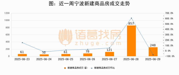 根据宁波市房产市场管理中心数据显示,2025年06月29日宁波新建商品房成交248套,较昨日减少609套,环比下降71.1%