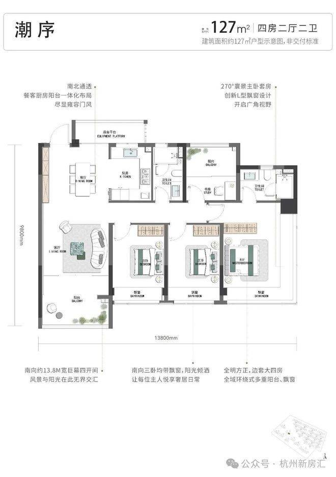 再来看项目的四房户型,有建面约127方、约130方2款。控总价的建面约127方:这款户型的每一点巧思,统统都是豪宅标准:LDKB的户型设计;封包阳台+3卧室均带飘窗;南向超大开间;