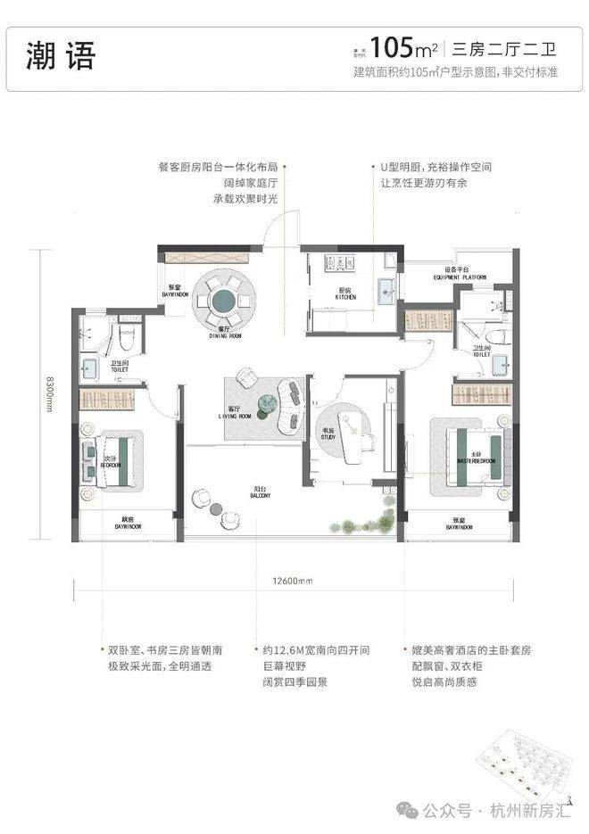 潮映杭园即将首开总价300万级墅区小高层,建筑面积约105㎡、127㎡、130㎡户型即将重磅面市。为最大化2.1万方中央园林的景观视野,项目突破性设计了建面约105㎡赏景四开间,建面约127㎡L型瞰景视野,建面约130㎡环景全面屏。