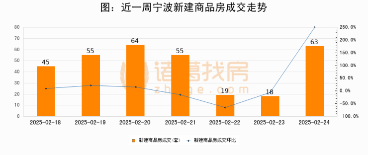 根据宁波市房产市场管理中心数据显示,2025年02月24日宁波新建商品房成交63套,较昨日增加45套,环比上涨250%