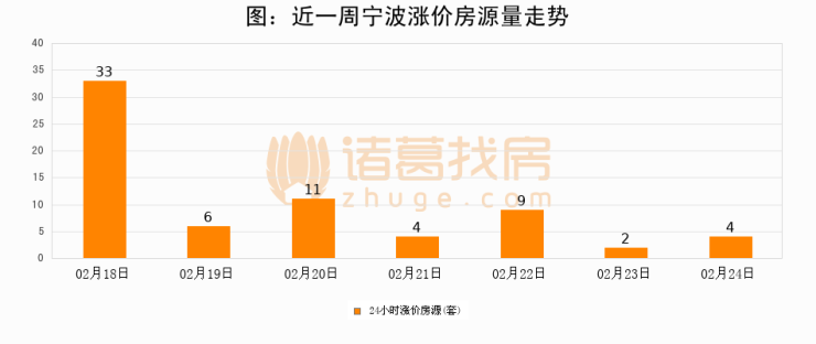 根据诸葛找房数据显示,宁波24小时涨价房源量为4套,较02月23日增加2套,环比上涨100%。与此同时,涨价房源占比小幅扩大,业主信心有所提升。