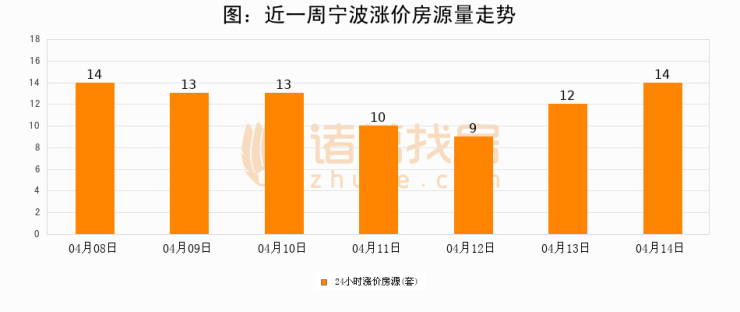 根据诸葛找房数据显示,宁波24小时涨价房源量为14套,较04月13日增加2套,环比上涨16.7%。与此同时,涨价房源占比小幅扩大,业主信心有所提升。
