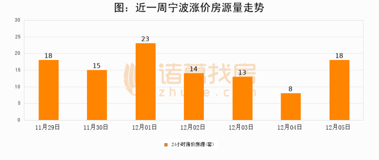 根据诸葛找房数据显示,宁波24小时涨价房源量为18套,较12月04日增加10套,环比上涨125%。与此同时,涨价房源占比小幅扩大,业主信心有所提升。