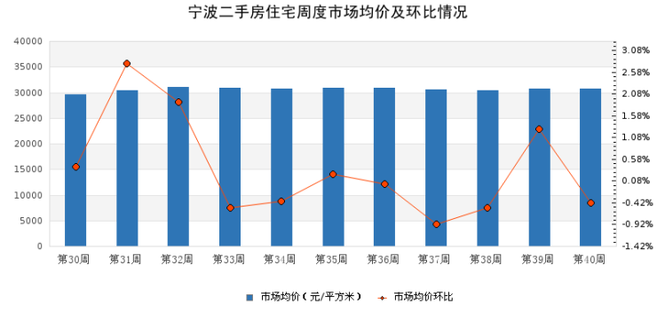 2021年第40周宁波二手住宅市场均价环比下降0.42%:据诸葛找房数据研究中心监测,2021年第40周宁波二手住宅市场均价为30661元/平方米,环比下降0.42%。