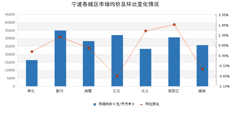 2021年第40周宁波2城区市场均价下跌,5城区环比上涨:据诸葛找房数据研究中心监测,2021年第40周宁波2城区市场均价下跌,5城区环比上涨。从城市涨跌幅情况来看,高新区市场均价环比涨幅居首,本周涨幅为1.88%,江北跌幅居首,环比下跌0.65%。