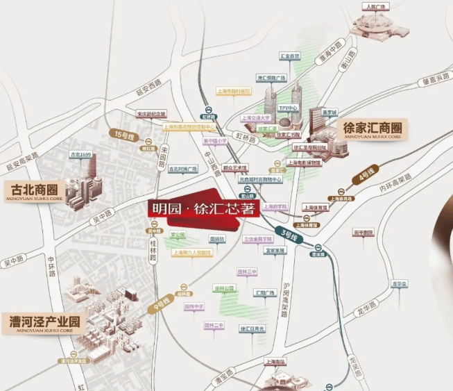 项目周边四轨环绕:与3、4、9号线宜山路站,直线距离695米!与15号线吴中路站,直线距离约680米,通达上海市中心!
