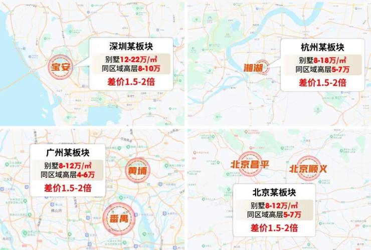 新房阶段,叠墅与高层定价大多维持在1.2:1的温和差距;而进入二手房市场,价差会显著拉开——北京、深圳、杭州等同区域内,成熟别墅产品单价普遍是高层1.5-2 倍,这已是市场共识。