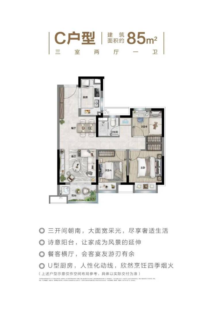 我们一起来看看以下明星户型: 建面约77㎡2 房、建面约85㎡小3 房、建面约95㎡大3 房,以及建面约115 ㎡4 房。