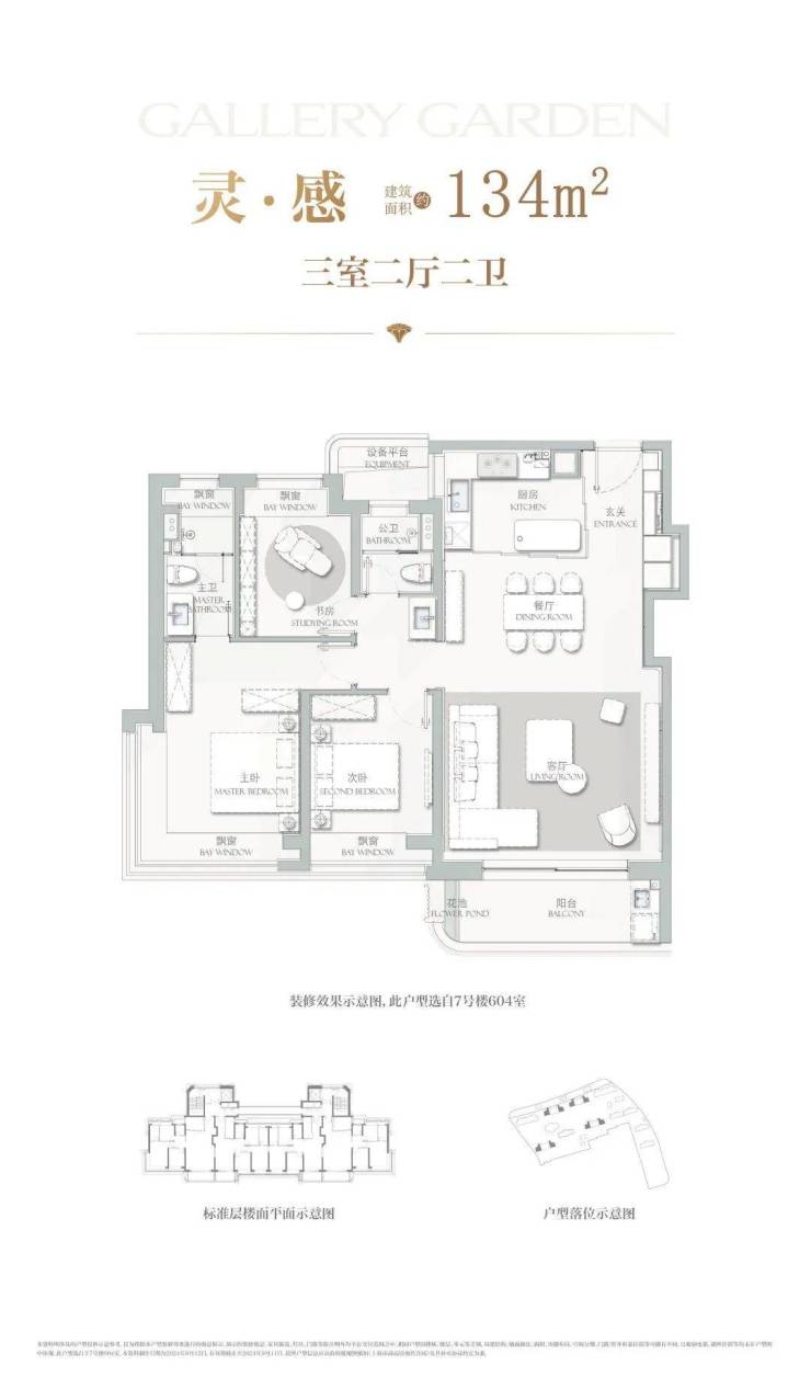 建面约134㎡3房2厅2卫,主力总价约1500-1700万,户型设计在上一个户型的基础上将各功能间尺度升级的同时,也做了一些更人性化的迭新。