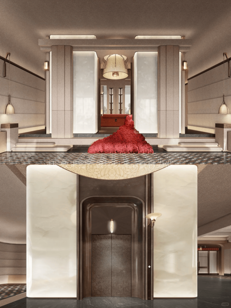 公区方面,从归家社区大堂、大堂序厅、以及入户单元大堂一路看过来,体现出一套脉络完整,层层递进的海派顶奢设计语言。