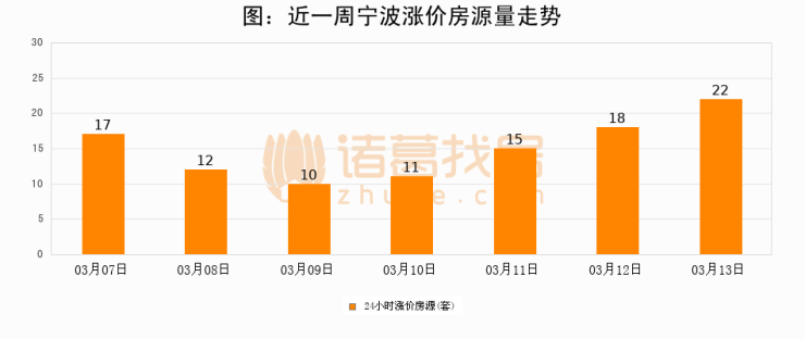 根据诸葛找房数据显示,宁波24小时涨价房源量为22套,较03月12日增加4套,环比上涨22.2%。与此同时,涨价房源占比小幅扩大,业主信心有所提升。