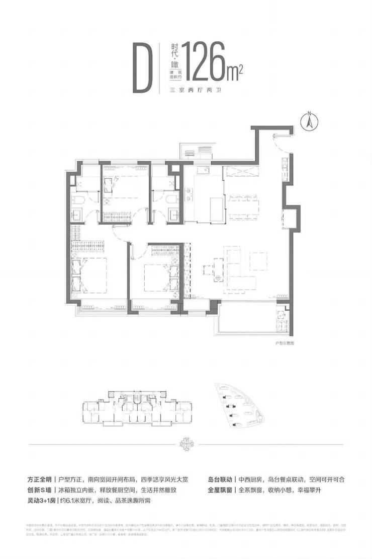 建面约126平的三房两厅两卫,在这个面积上做横厅大三房,整体的空间感和尺度感很不错,适合改善型家庭。