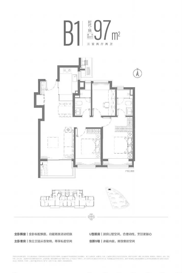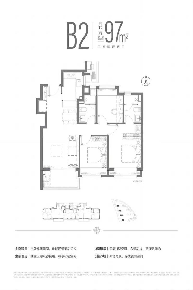 建面约97平的三房两厅两卫,在89户型基础上多了一个卫生间,450-500万级别功能性更强。