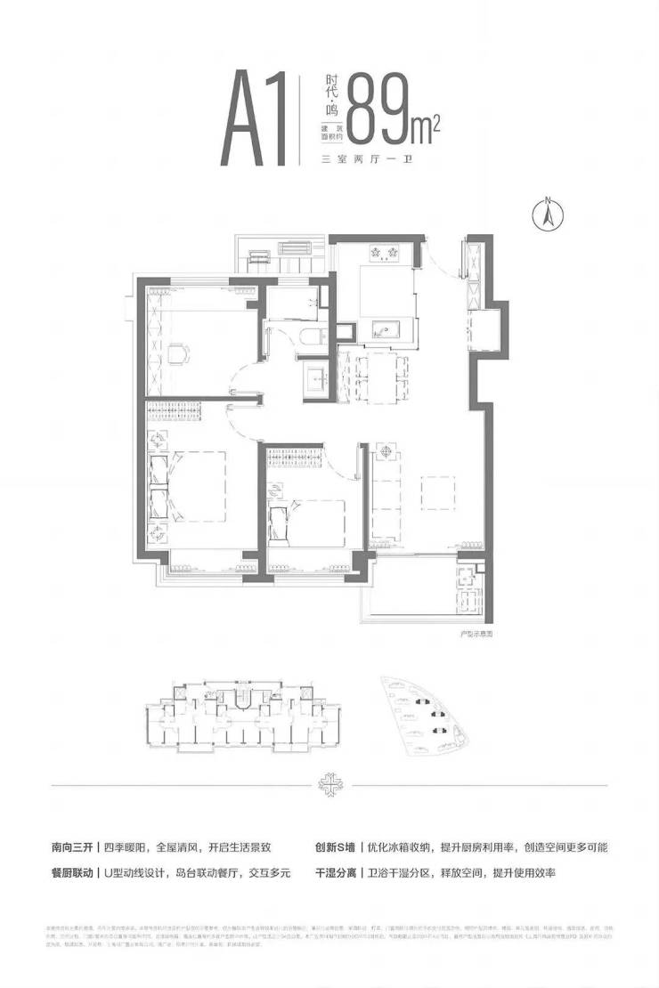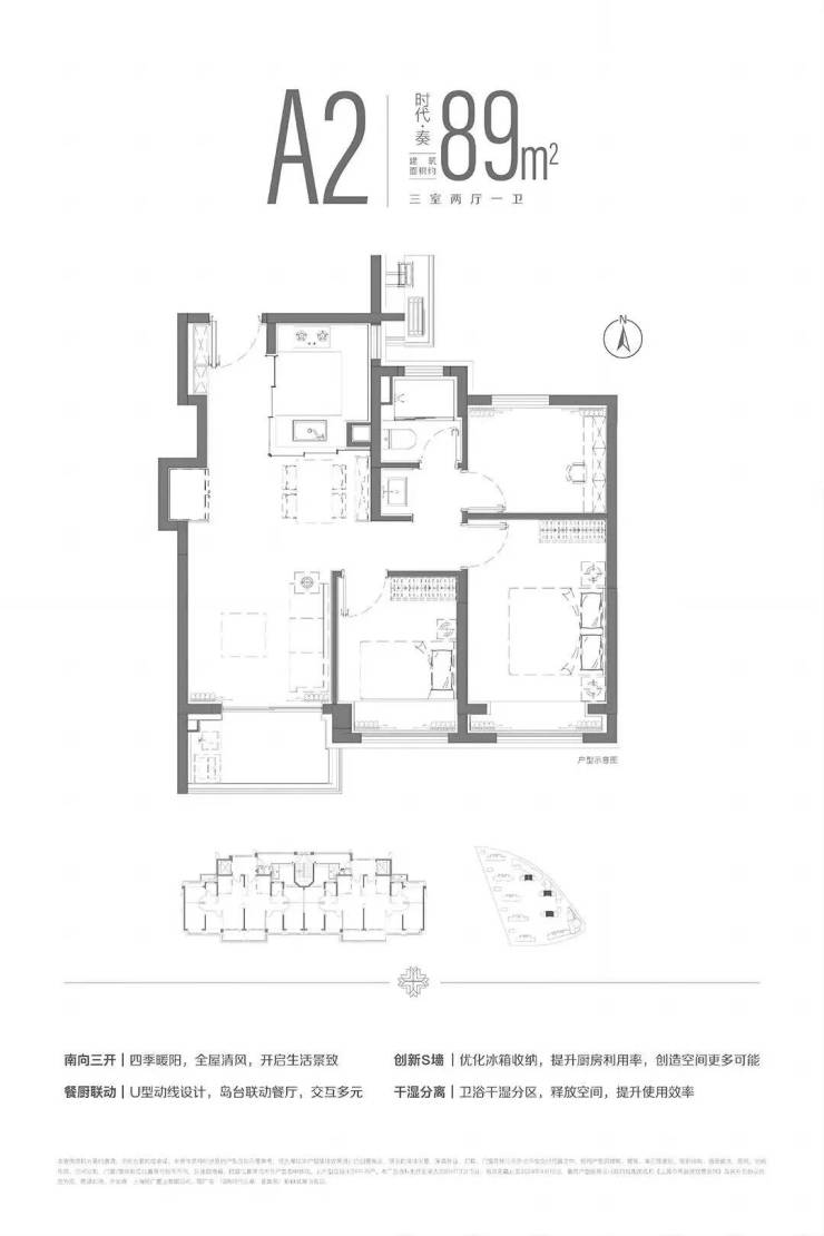 建面约89平的三房两厅一卫,400万级别主打低总价,三开间朝南,通过S墙的设计解决了冰箱空间问题。