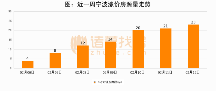 根据诸葛找房数据显示,宁波24小时涨价房源量为23套,较02月11日增加2套,环比上涨9.5%。与此同时,涨价房源占比小幅扩大,业主信心有所提升。