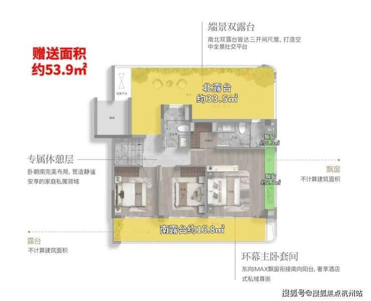 ③、二层是 南北双露 台的配置,为盆栽园艺、星空茶室、阅读角落等个性化生活场景提供了无限可能。